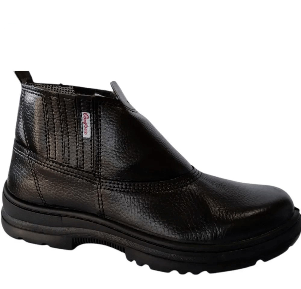 Botina de segurança confeccionada em couro vaqueta integral estampa relax, com elástico nas laterais. Possui o droso acolchoado, palmilha interna removível em EVA com tratamento antimicróbios. Indicada para serviços em áreas que apresentem riscos de natureza leve, uniformizando e garantindo conforto e proteção aos pés e tornozelos do usuário.